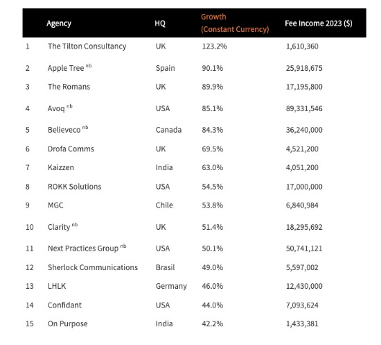 Por su parte en Estados Unidos, la agencia de más rápido crecimiento fue Avoq, la más grande entre las 10 principales de este año. Desde que fue creada por la fusión de las firmas de asuntos públicos Subject Matter y Kivvit en mayo pasado, creció un 85,1% equivalente a $89,3 millones de dólares, siendo también la cuarta agencia de más rápido crecimiento a nivel mundial.